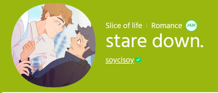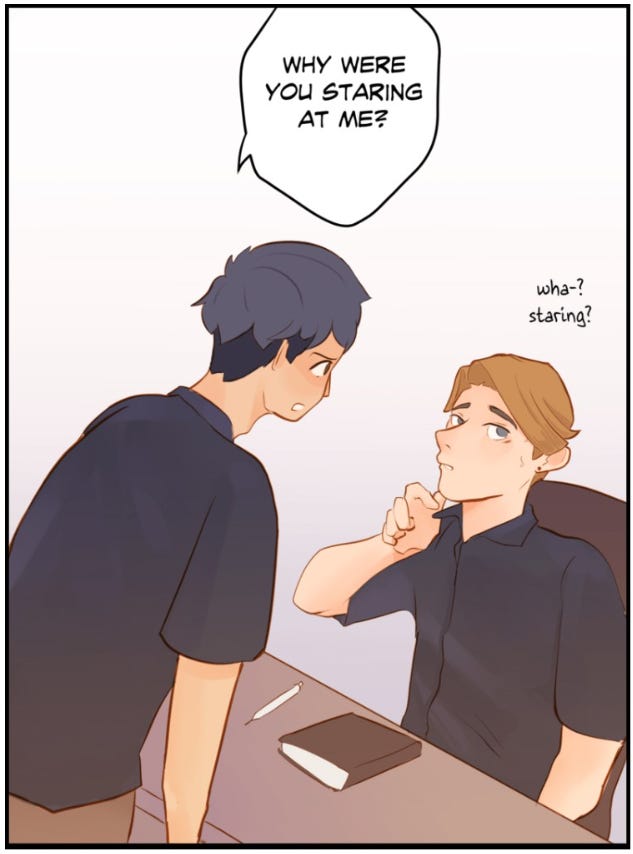 One of my favorite things about stare down. is the pacing. Creator, Soyciscoy, spends the perfect amount of time on each juncture of Pas and Nil's relationship before evolving it to the next step.