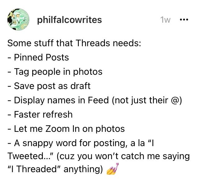 I don't know if I just got lucky with my doomscrolling those first few hours or if something changed algorithmically, but I eventually ran into my biggest problem with Threads - the Feed. Most days, it's 20% folks I actually follow and/or am interested in, and 80% big celebrities or brands that I have no interest in.