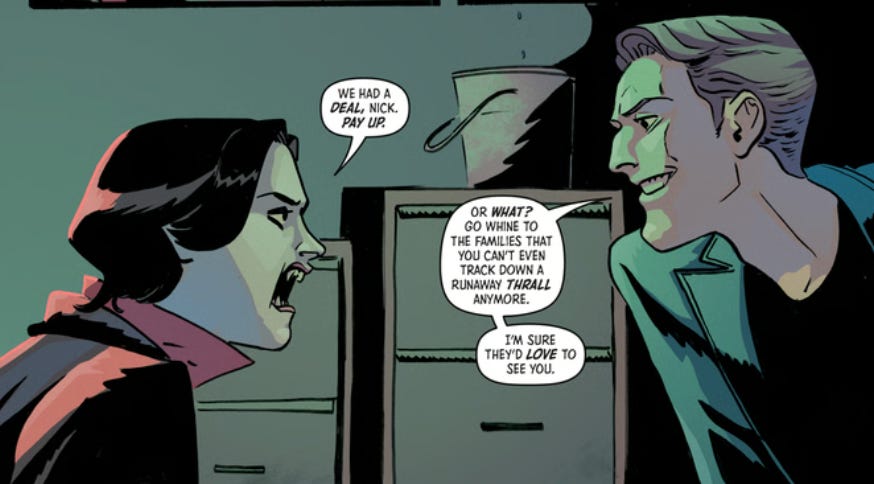 Knight: Visually, I was definitely influenced by American Vampire and Lady Dimitrescu from Resident Evil Village when it came to drawing their monstrous, extended claws and mouths uncomfortably large when snarling. Adeline is our stylish mob boss vampire who runs the show, Aleksander is our wiry muscle, Florence is our REDACTED and Corsica is what happens when you smoosh Jessica Jones and Dylan Dog together and add fangs. I think they all have that familiar vampire trait of being self-serving but the fun is in showing how each of them goes about it and, certainly for Florence and Corsica, the spice is in how they use each other to get what they want.