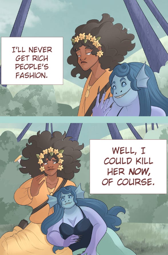 The “lore” of the series is also fun, with just the right amount of time spent so far balanced between establishing the mythos and actually sitting with the characters. There’s already some serious flirting going on between our leads, so I’m excited to see where the series goes as the core romance continues to unfold (and the Sea Dragoness gets more opportunities to eat her love interest).