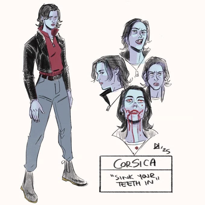 Tunnell: Our vampires are a fun combo of classic vampires but with a more...modern lens, I suppose? All of the old stand-bys, not being able to be out in the sun, needing blood to survive, can’t enter anyone living’s home without an invitation, etc. but with some fun ways that affects the world around them. For one, Corsica can’t use anything with a touch screen. No blood flow, no pulse, no body heat. Capacitive screens very much like all of those things, so, it’s all old-school analog tech for our gal.
