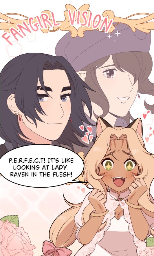 Phil: A lighthearted fantasy slice of life Sapphic romance about an adventurer, Vera, and her whimsical fangirl wife, Ira. For fans of queer romance stories that start out with the couple already happily together, this is the read for you. Our lead couple are happily married right at the opening of the series and enjoying all of the cute romance tropes you love to see from a married Sapphic couple.