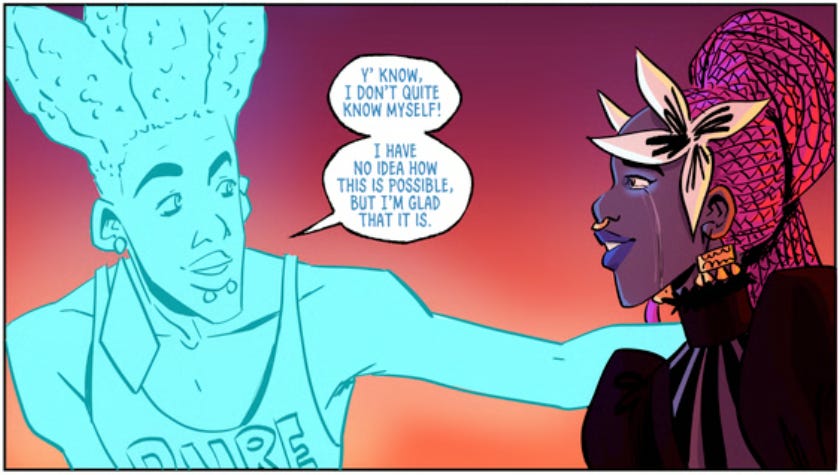 Beyond just the aesthetic, what attracts me to the comic is a saccharine earnestness that jumps right off of the page. Everybody’s Happy Nowadays pitches itself as “a story about love, loss, and finding yourself in a world that’s anything but normal”. Even from just the preview we see on the page, the characters and their experiences feel real and lived in. Very excited to give this book a read!