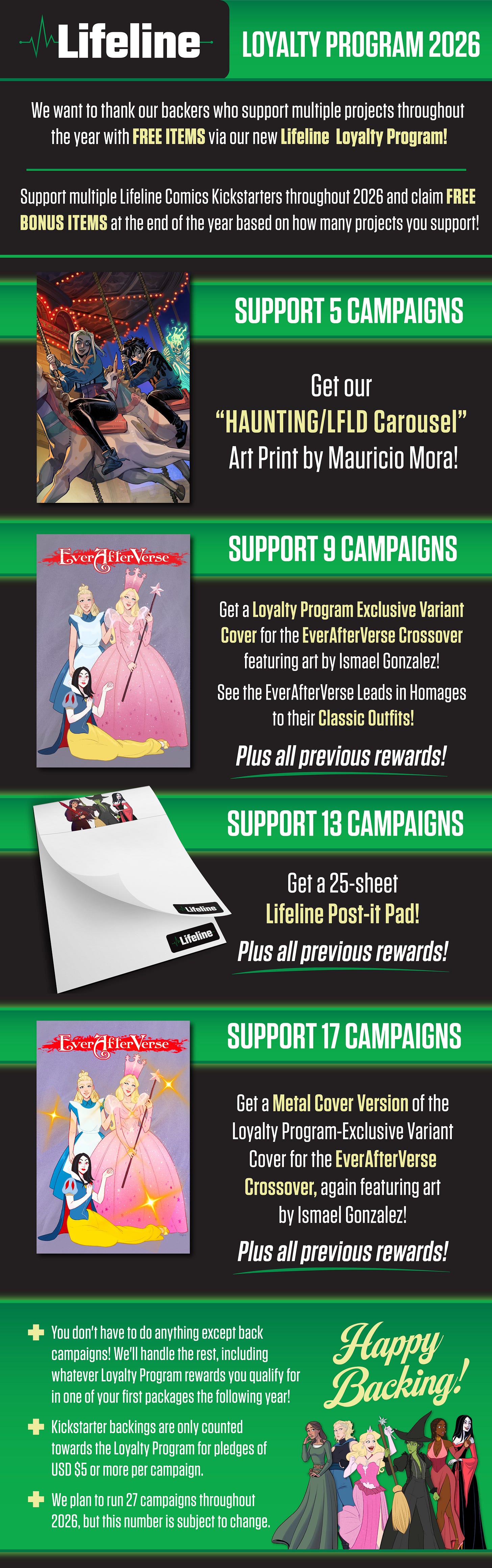 Lifeline Comics will tally up how many Kickstarter projects each backer has supported and will include your Loyalty Program 2025 FREE ITEMS in one of your packages sent out in 2026.